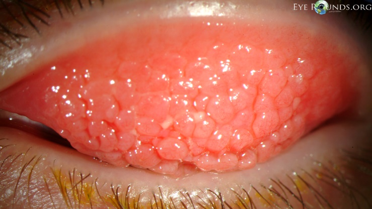 - Đỏ mắt: mắt đỏ hồng do viêm kết mạc, có các nhú trên bề mặt mi mắt.